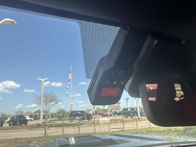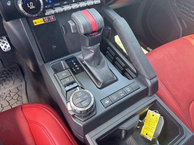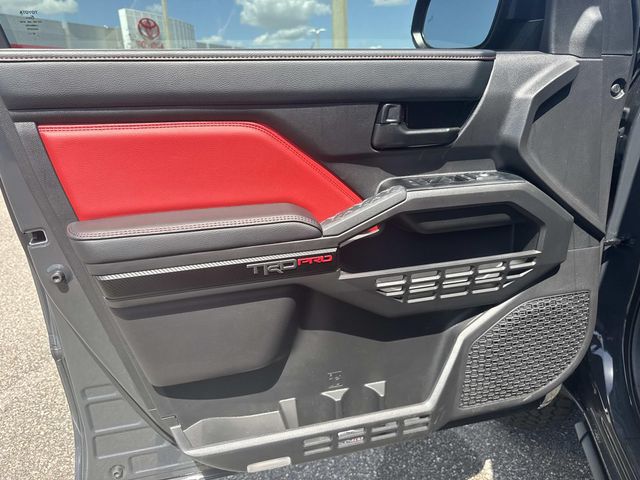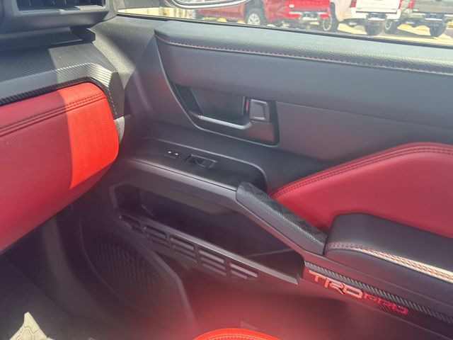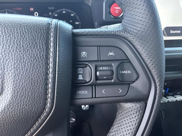 - TRD Pro leather-trimmed manual tilt/telescopic steering wheel with TRD badge, red center stripe, and phone, audio, display/infotainment, and Driver Assist controls